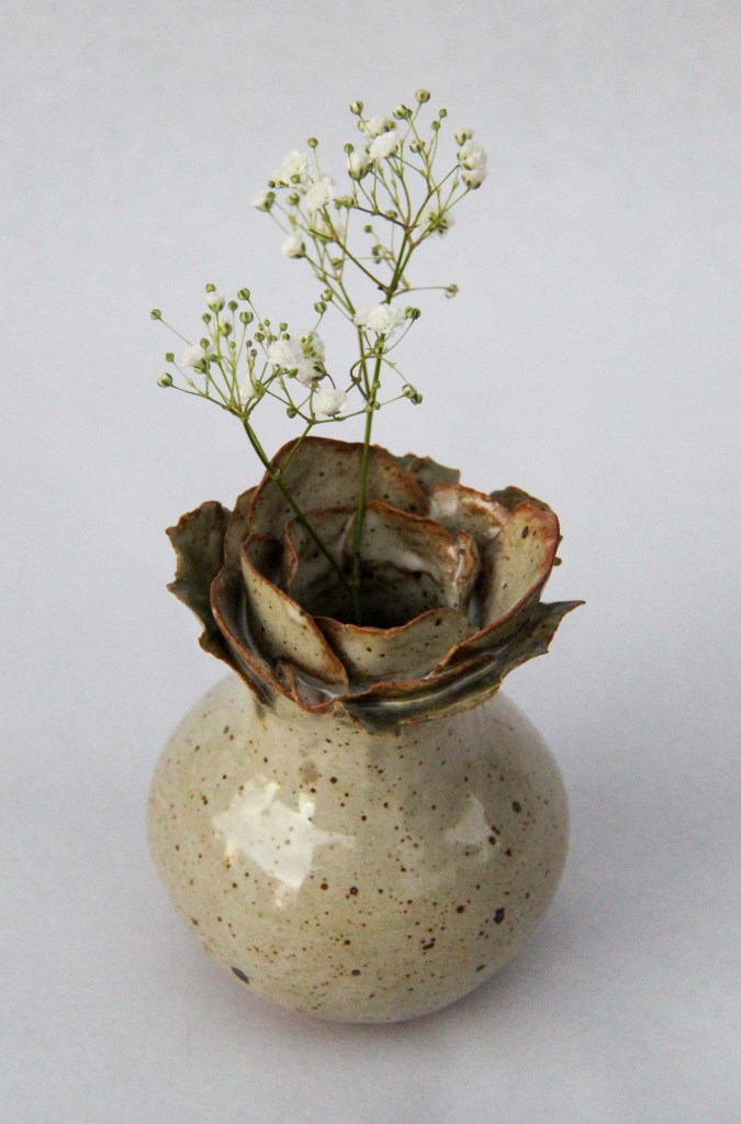 Together. These pieces are coil built, each representing a member of my family. The pieces can be taken apart and held by the viewer and serve as functional vases. I layered glazes to create visually textured earth tones.