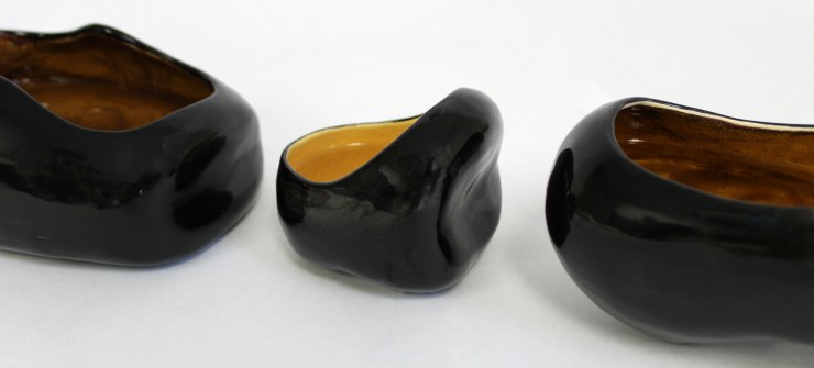 Ant Support. Slip-cast ceramics, 41 pieces, encased in 2 wooden frames. Earth tones on the outside, glowing gold on the inside to make the viewer interact with the piece.