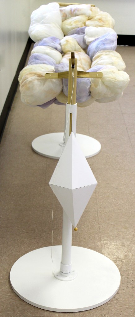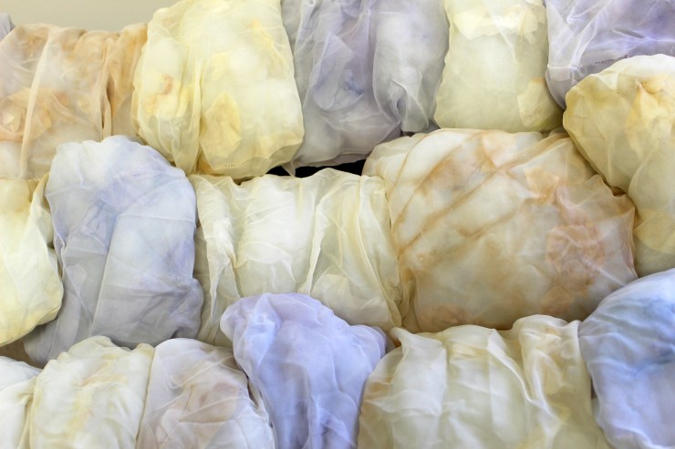 Water Molecules. Natural dyed fabric from local restaurant food waste, hand sewed water molecules/ants, hand-cut wood, polyvinyl chloride pipes. Each form represents an ant and a water molecule, and altogether they symbolize resilience, strength, and the power of a collaborative community.