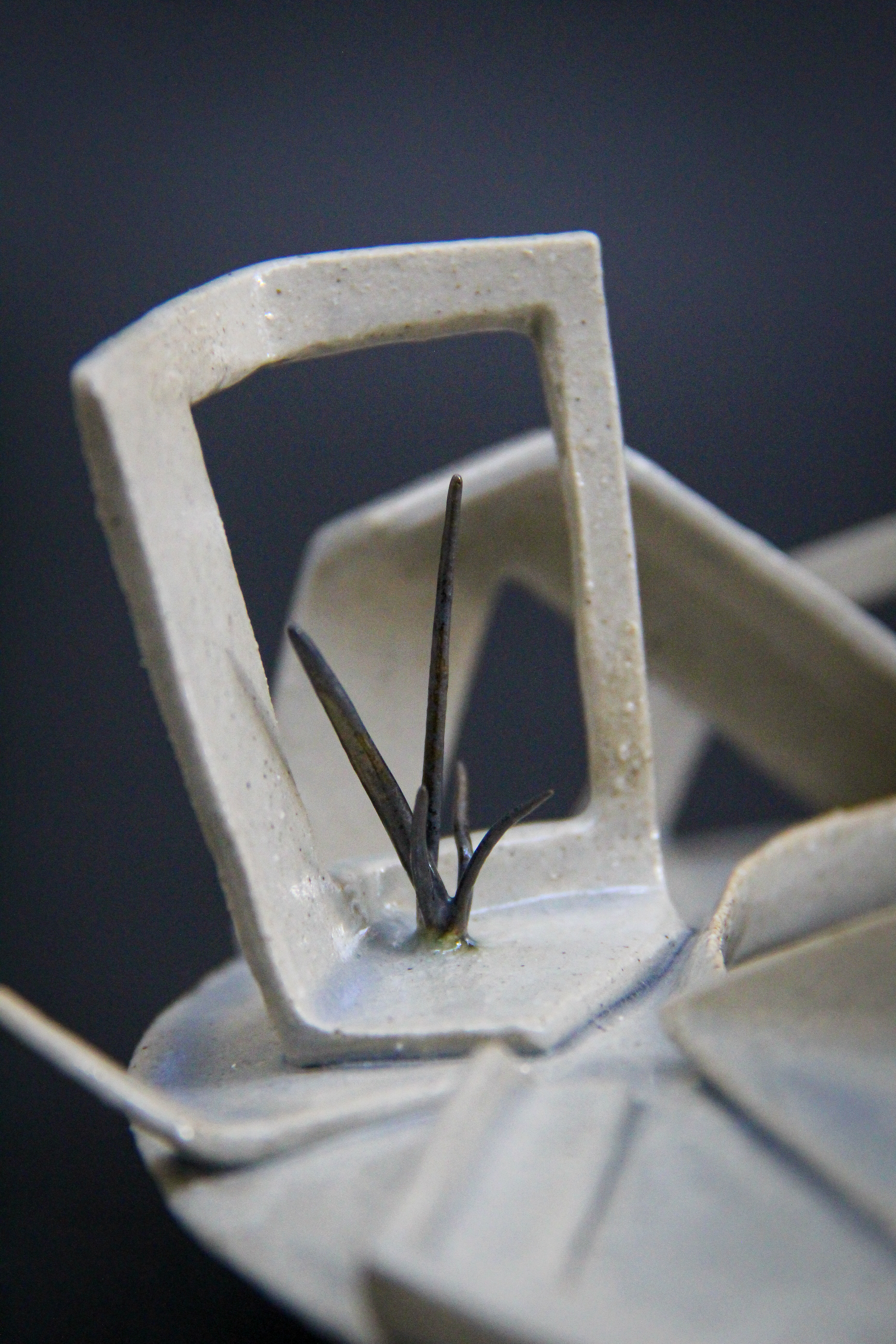 This ceramic stoneware piece combines wheel throwing, slip casting, and handbuilding in clay. An Etruscan inspired wheel thrown pot is the base for the four endangered plant species to South Carolina used in Let’s Bulldoze It. Delicate cut out shapes from slip cast forms are also incorporated. With a focus on detail, I use the negative space created by overlapping geometric shapes to enhance and create focal points out of mundane natural elements. This stoneware piece was sprayed with hand-mixed clear glaze, resulting in hints of cobalt where the glaze pooled.