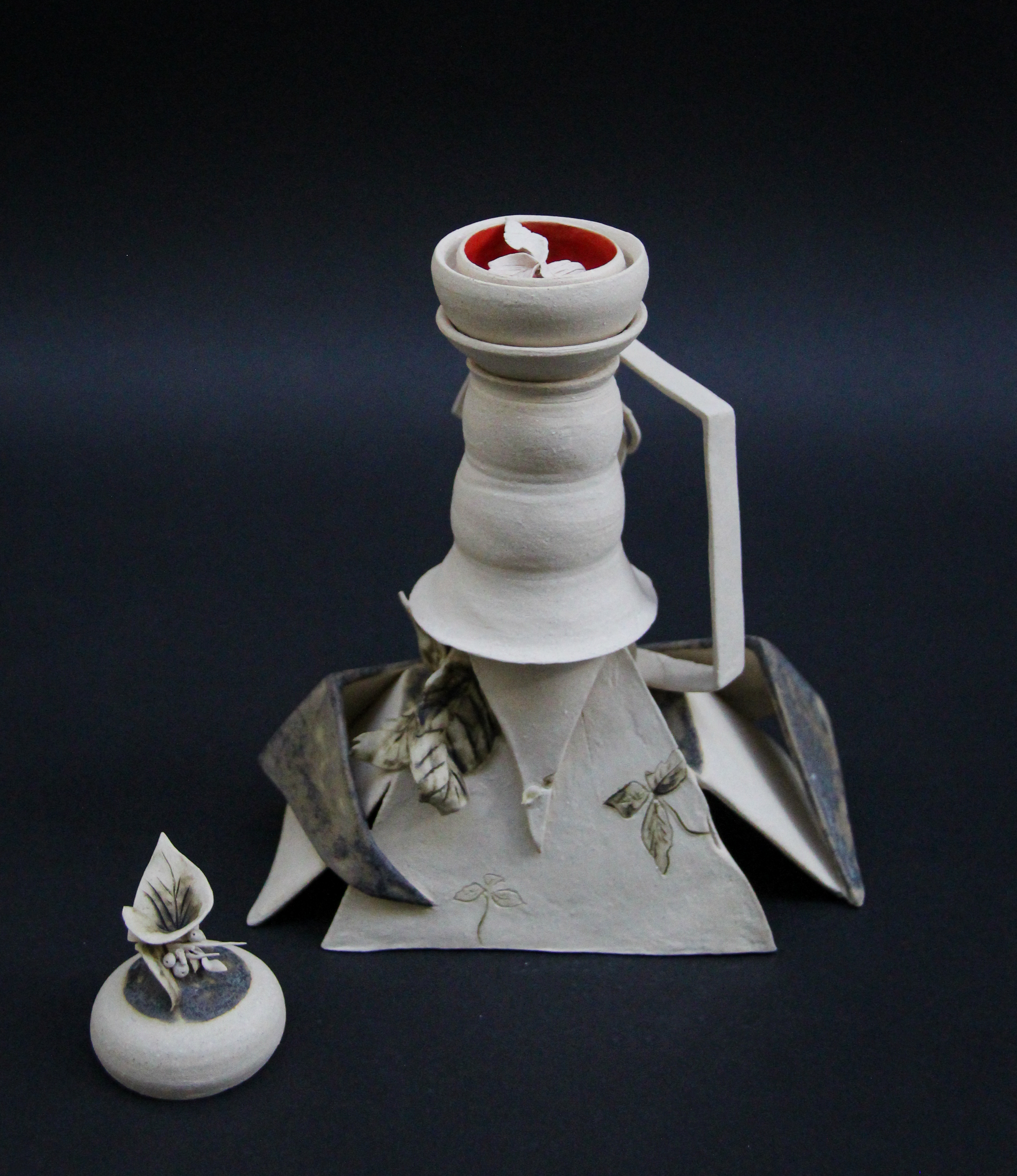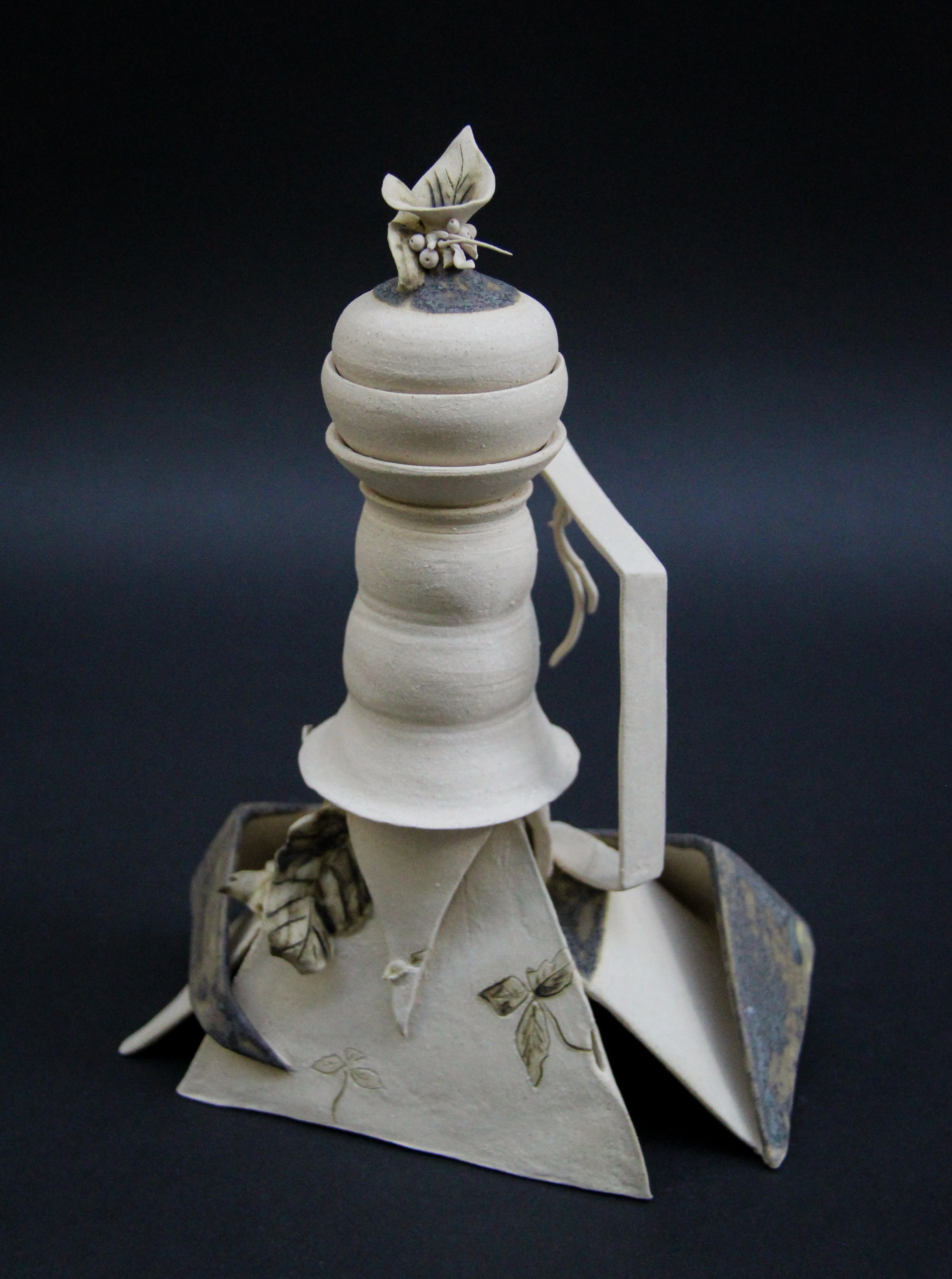 This stoneware piece combines slip casting, handbuilding, and wheel throwing. The 2D renderings of the climbing kudzu are reflected in the 3D modeling. The vine grows all around the piece until it reaches the quiet bowl at the top.