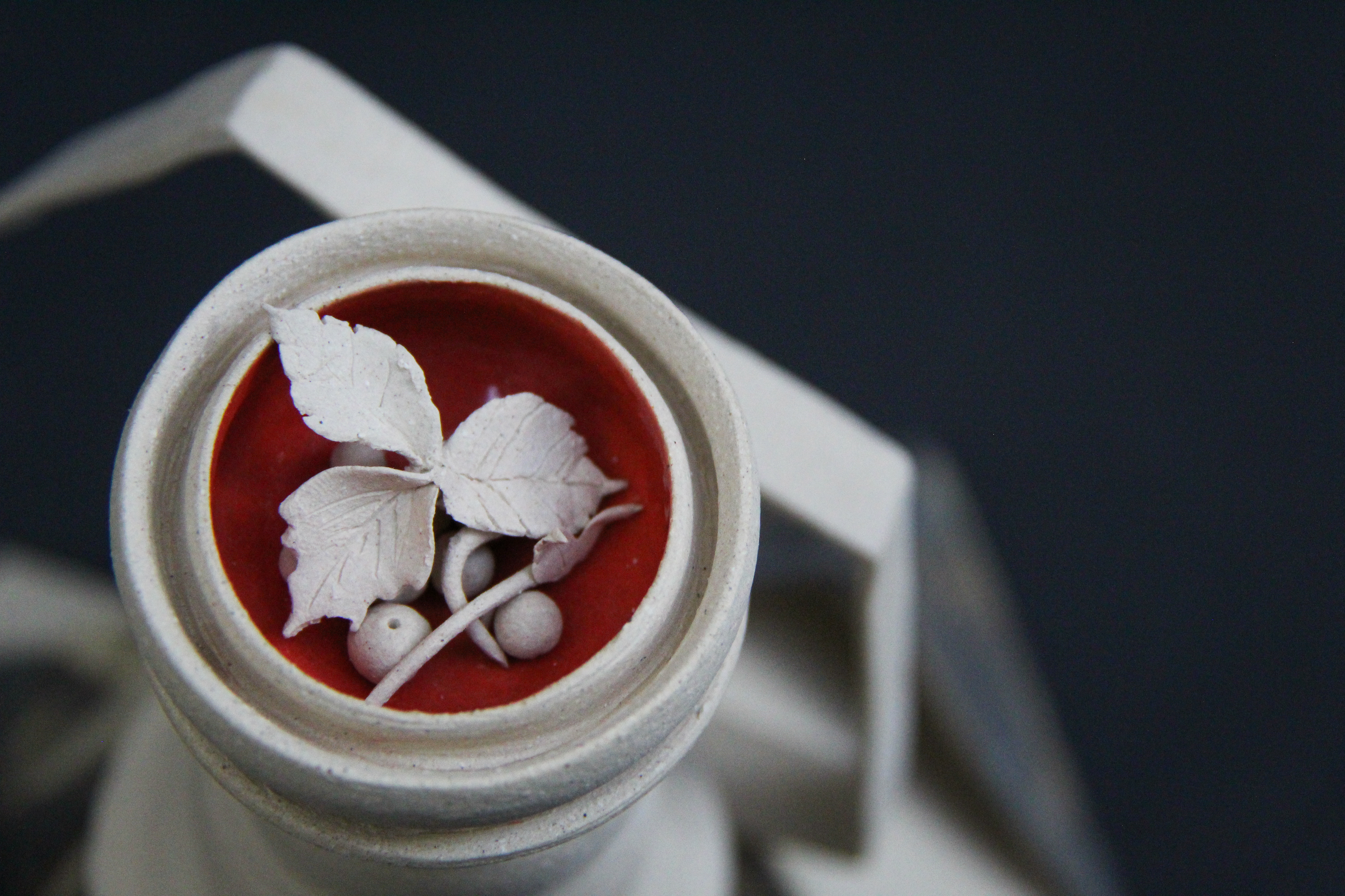 This ceramic stoneware piece combines slip casting and wheel throwing with handbuilt leaves, which represent poison ivy. The 3D ivy is reflected on the base and around the sides in 2D renderings. Encased within the central lidded form are small leaves and poison ivy berries. The detail and delicacy of the piece contrast the harsh, irritating, poisonous plant, which is encased inside the elevated bowl. This signifies the value and importance of every plant to its ecosystem, no matter how inconvenient it is to humans.